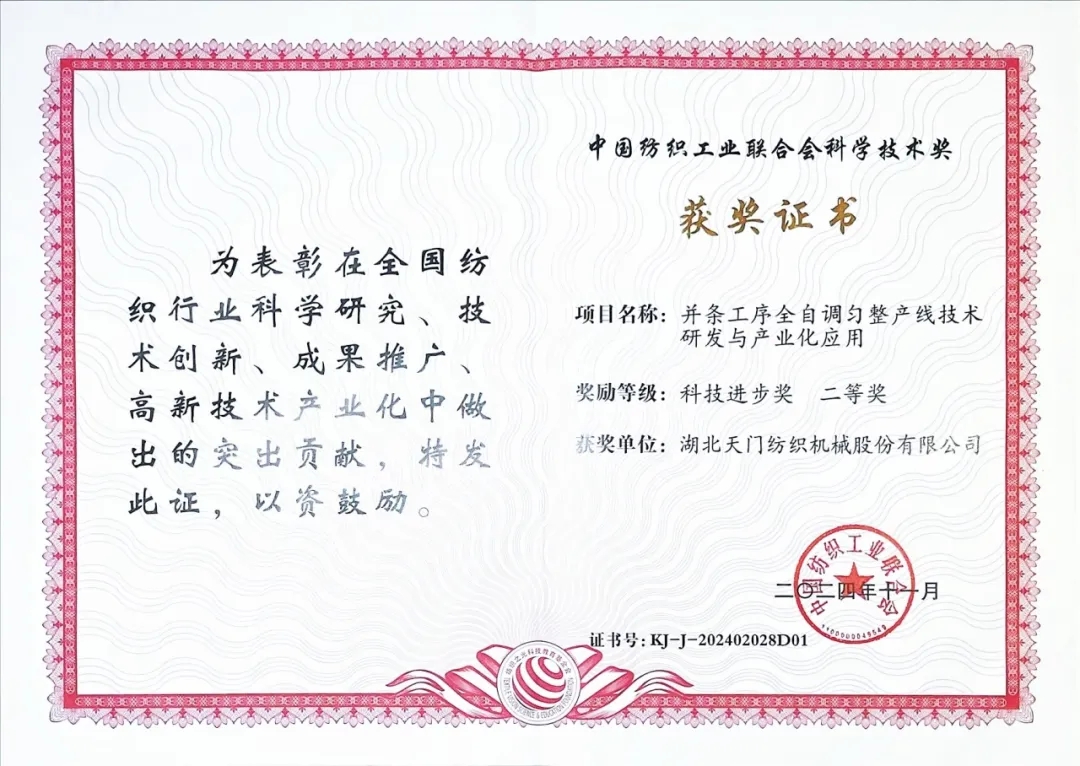 2024年11月12日,在北京人民大會堂召開的2024年度中國紡織工業(yè)聯(lián)合會科學(xué)技術(shù)獎(jiǎng)勵(lì)大會傳來喜訊,由天門紡機(jī)主導(dǎo),武漢紡織大學(xué)、安徽華茂紡織股份有限公司、武漢銀橋南海光電有限公司等單位合作開發(fā)的“并條工序全自調(diào)勻整產(chǎn)線技術(shù)研發(fā)與產(chǎn)業(yè)化應(yīng)用項(xiàng)目”獲得2024年“中國紡織工業(yè)聯(lián)合會科學(xué)技術(shù)獎(jiǎng)”科技進(jìn)步二等獎(jiǎng)。